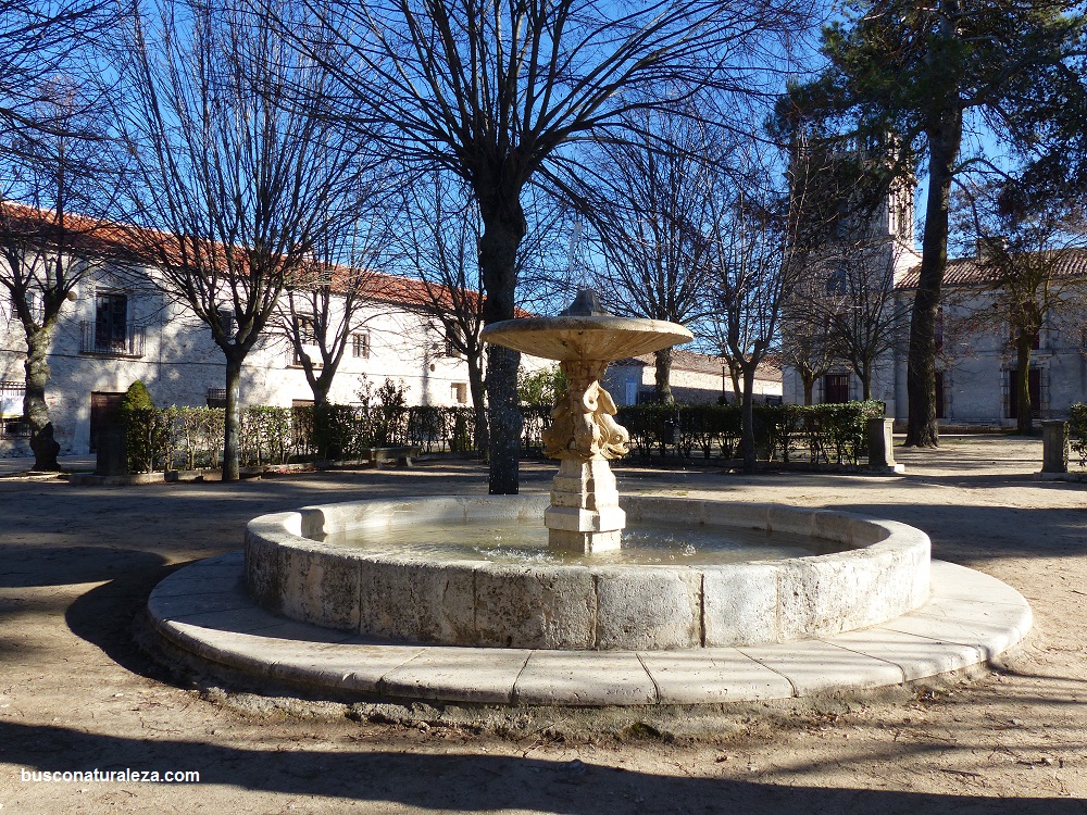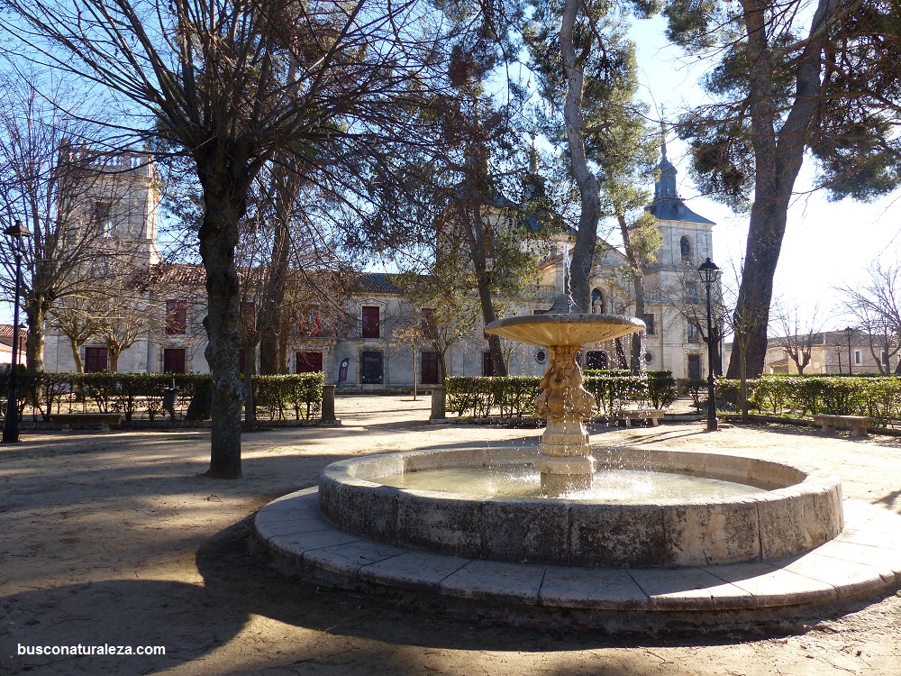 La Fuente de Tritones está ubicada en la Plaza de la Iglesia, que, como ya os indiqué, se sitúa frente al Palacio. Es la única fuente diseñada por José Benito de Churriguera. Esculpida en piedra caliza originaria de Colmenar de Oreja, los tritones, en dos parejas, sujetan del plato donde cae el agua para después caer al estanque. Tuvo que ser restaurada y se enclavo un poco más al norte de lo que estaba para centrarla.