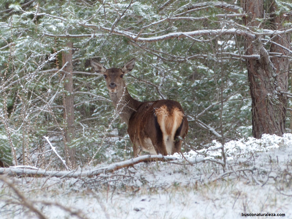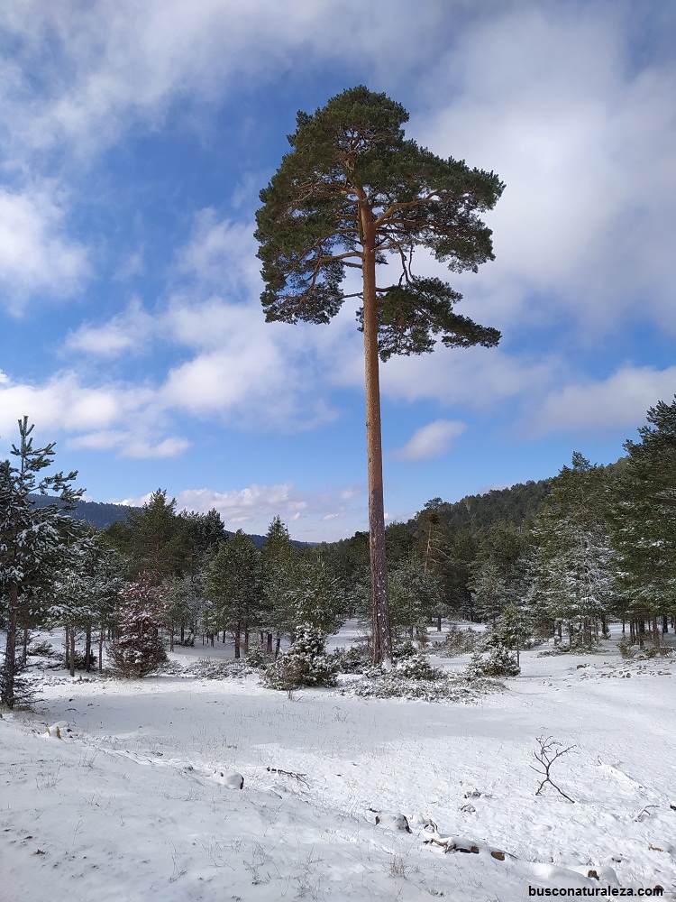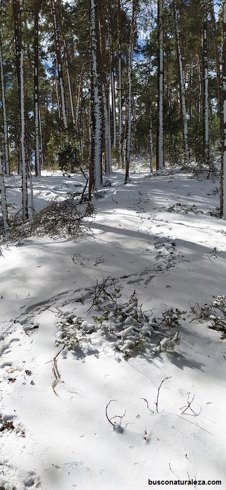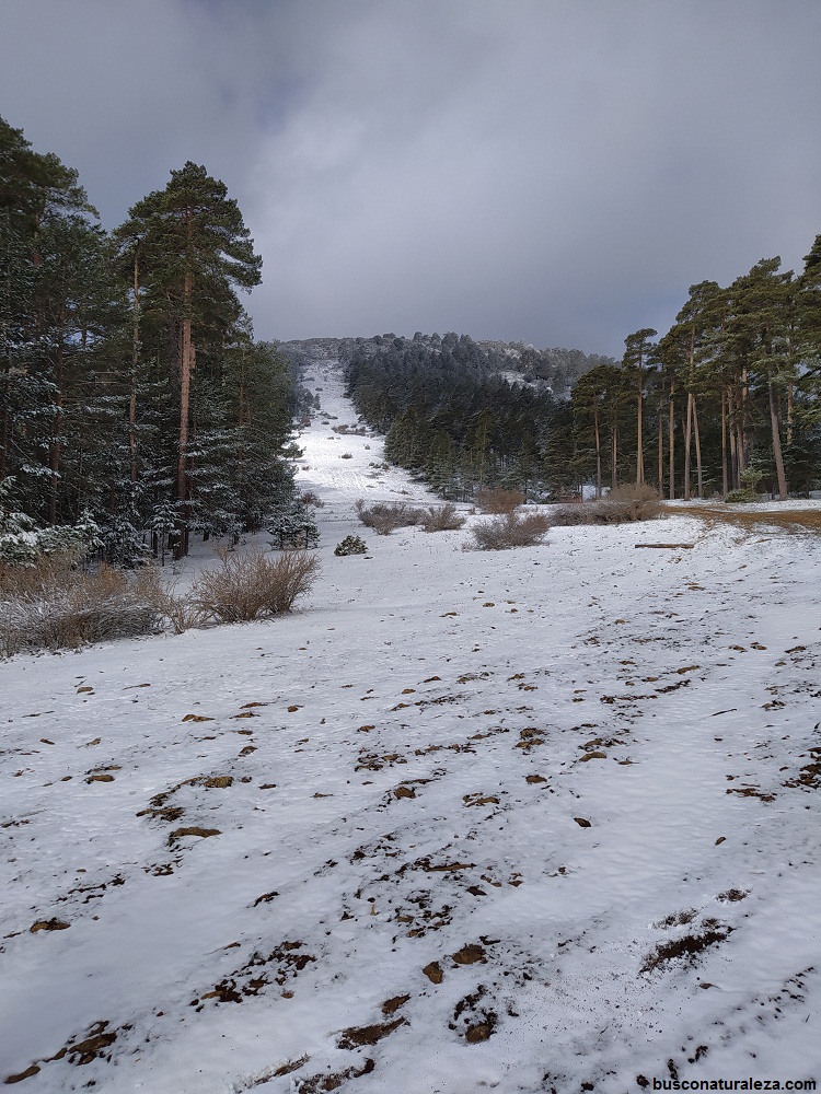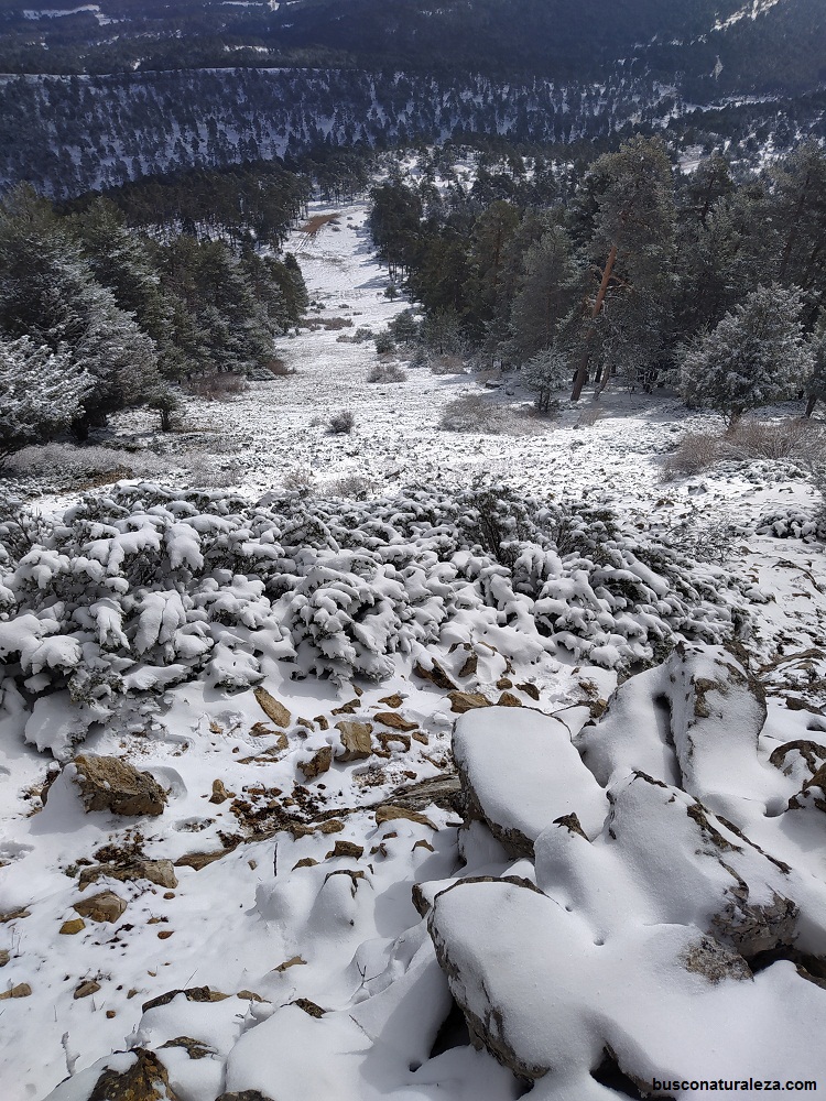 Esta vez la bajada la haremos entre pinos, en nuestro caso como estaba nevado no se veía ninguna senda y bajamos por donde nos pareció mas cómodo.