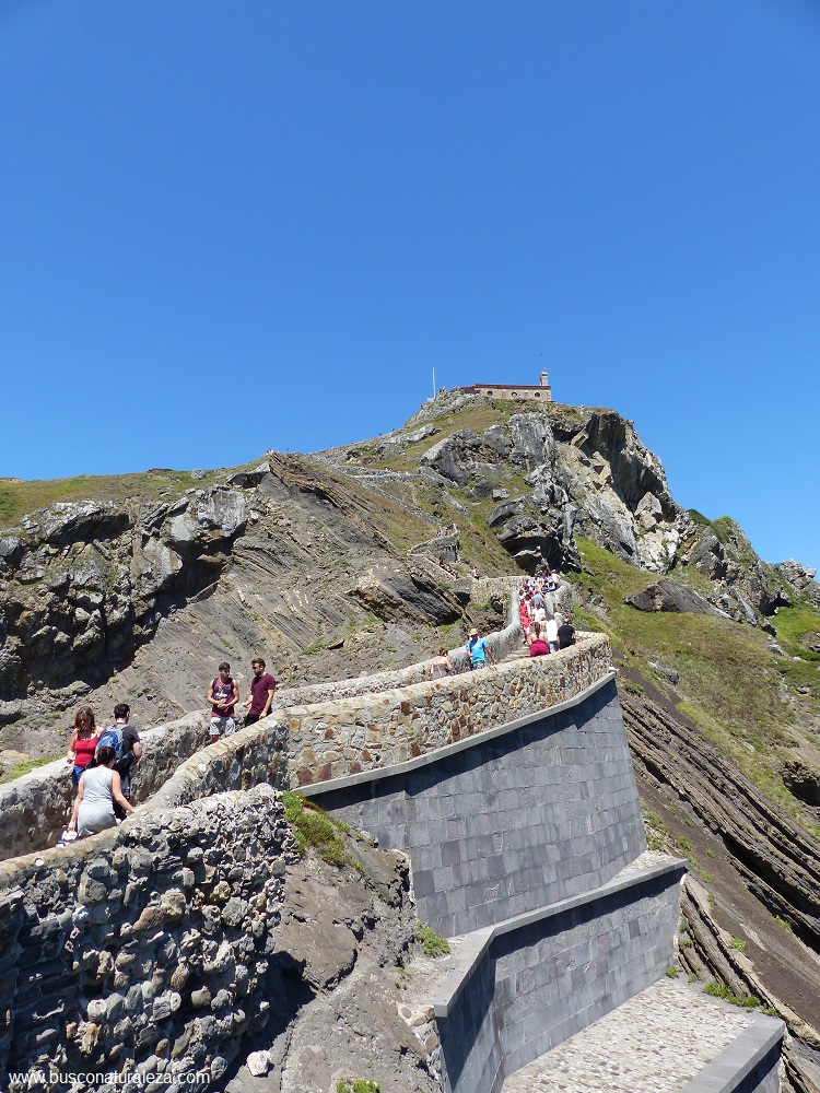 Cuando lleguemos al nivel del mar podemos mirar a ambos lados del camino y ver el espectacular paisaje, a continuación nos adentramos en el estrecho pasillo por encima del mar que nos lleva hasta la escalera de 241 peldaños que sube zigzagueando hasta la ermita en la cima del islote, creo que es la escalera con mejores vistas que he subido en mi vida.